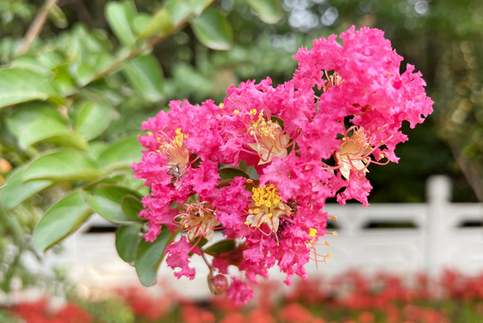 紫薇(Lagerstroemia indica)千屈菜科紫薇属、落叶灌木或小乔木。原产亚洲,现广植于热带地区。紫薇的花非常特别,每朵花有6瓣,整个花型好似一个轮盘,每逢盛开的时候,花朵一般都成串成团地簇拥着,层层叠叠,十分动人。它的花瓣有很多卷曲的皱褶,边缘还有锯齿状,并不刺人,而花朵儿卷曲的皱褶,就像卷笔刀卷出的漂亮铅笔花一样。紫薇花色艳丽,开花时正当夏秋少花季节,花期极长,由6月可开至9 月,故有“百日红”之称,又有"盛夏绿遮眼,此花红满堂"的赞语。就连宋代杨万里也曾在诗中写道:“谁道花无红十日,紫薇长放半年花。”(观赏地点:锦葵园)