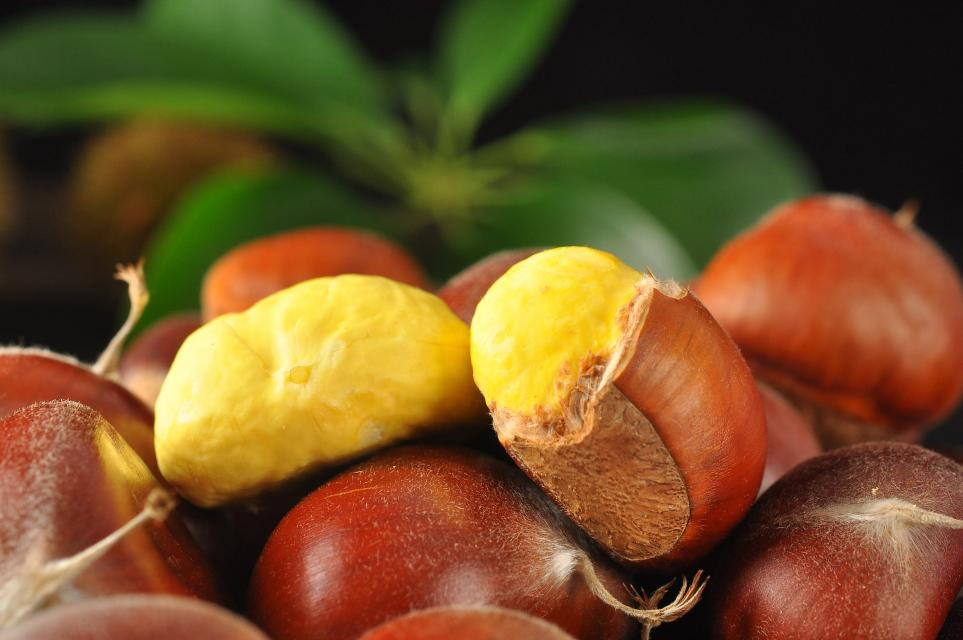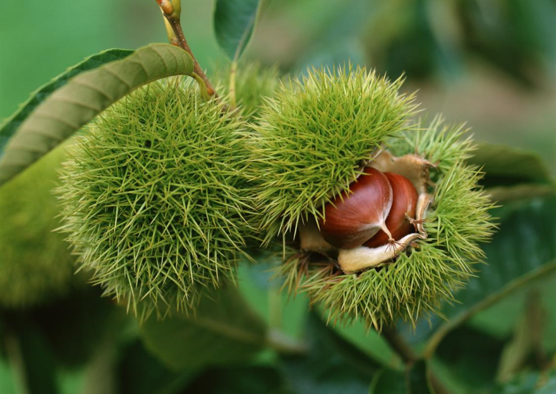 相信很多人都采摘过野板栗,其模样好似一只绿色的小刺猬。那是因为板栗除了有坚韧的硬壳外,还有一层密布尖刺的“壳斗”。这个“壳斗”其实是由总苞,也就是一类特殊的叶片发育而来的,里面包裹的每一个板栗,都是一个独立的小果子。成熟时,壳斗会十字而开,棕红色的栗子才会露出真身。也正因为板栗穿着布满尖刺的“外套”,才能更好地保护自己的果实,让想吃它的动物,无从下嘴。不过,在很多人眼里板栗并不算坚果。因为坚果给人的印象是“香脆”,板栗却是“甜糯”。这是因为种子的脂肪含量越高,口感就越脆,而板栗富含淀粉,脂肪含量并不高。