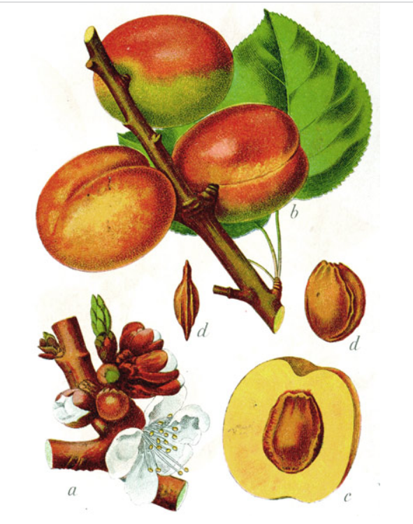 杏(Prunus armeniaca)乔木,叶片宽卵形或圆卵形,叶边有圆钝锯齿;花单生,先于叶开放;花梗短小,花瓣圆形至倒卵形,颜色为白色或略带红色;果实球形、稀倒卵形,颜色从白色、黄色至黄红色不等,常带有红晕,果肉暗黄,味甜多汁。其核面平滑没有斑孔,核缘厚而有沟纹,敲开果核即可获取杏仁。