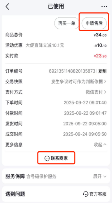 4.点击 “申请售后” 或 “联系商家”,并通过页面指引联系平台客服(抖音客服 / 美团客服)提交退单申请。