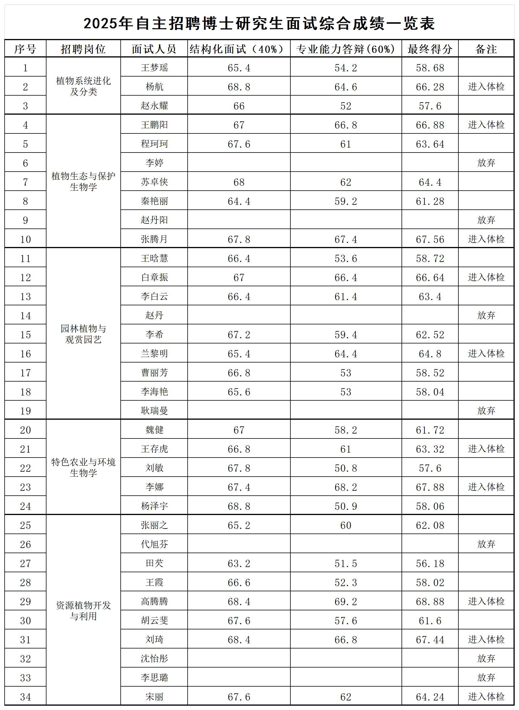 现将陕西省西安植物园(陕西省植物研究所)2025年公开招聘博士研究生面试成绩予以公示。体检事宜另行通知。
