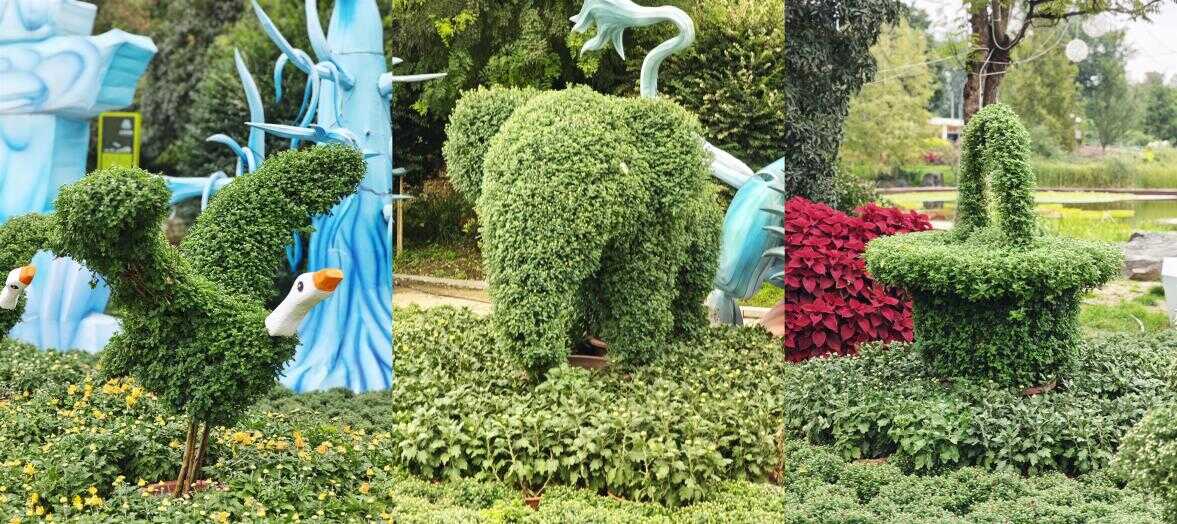 在西大门的艺菊迎宾展区,通过嫁接、修剪、整形及扎绑等多种艺术手法,将菊花塑造为海豚、仙鹤、蝴蝶、兔子、花篮等栩栩如生的造型,巧妙将自然与艺术融合在一起,展现出了菊花的另一种极致之美。为了满足游客赏花需求,为了让游客欣赏到更多的美景,今年花展结合园区水系,在水景园沿岸将盆菊和造型菊辅以水生植物,加上周围的树木、风车及充满童趣的景观小品,营造出别致的花海水岸景观。