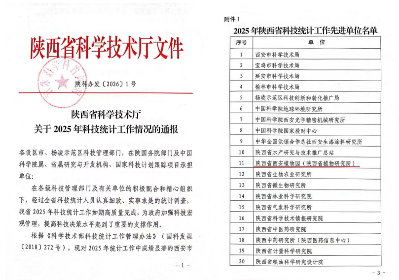 近日,陕西省科技厅召开了2025年度陕西省科技统计工作会议,根据《陕西省科学技术厅关于2025年陕西省科技统计工作情况的通报》陕科办发〔2026〕1号,对全省科技统计工作中规范高效、成效显著的30家单位和18名个人给予通报表彰。陕西省西安植物园荣获2025年度“全省科技统计先进单位”称号。