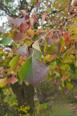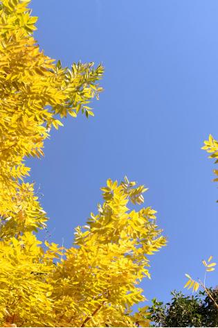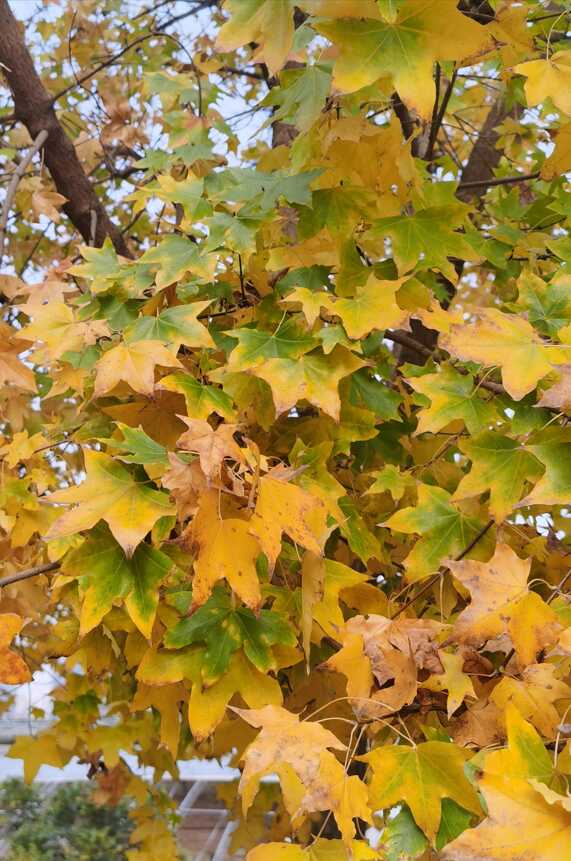 首先,树木会在叶柄基部形成多层特殊的薄壁细胞,称为“离层”。这道“堤坝”阻断了水分、矿物质与碳水化合物在叶片与树木之间的流通,也切断了叶绿素的合成原料,而其分解过程仍在继续。于是,叶片中浓郁的绿色开始消退,而一直隐藏在叶片中的类胡萝卜素便得以闪亮登场。它们从春天起就存在于叶片中,但因含量远低于叶绿素,绿色掩盖了它们的风采。类胡萝卜素主要吸收蓝光和蓝绿光,反射出黄色和橙色。像银杏、白杨那金灿灿的黄色,以及五角枫那温暖的橙黄色,主要就是这类色素的杰作。