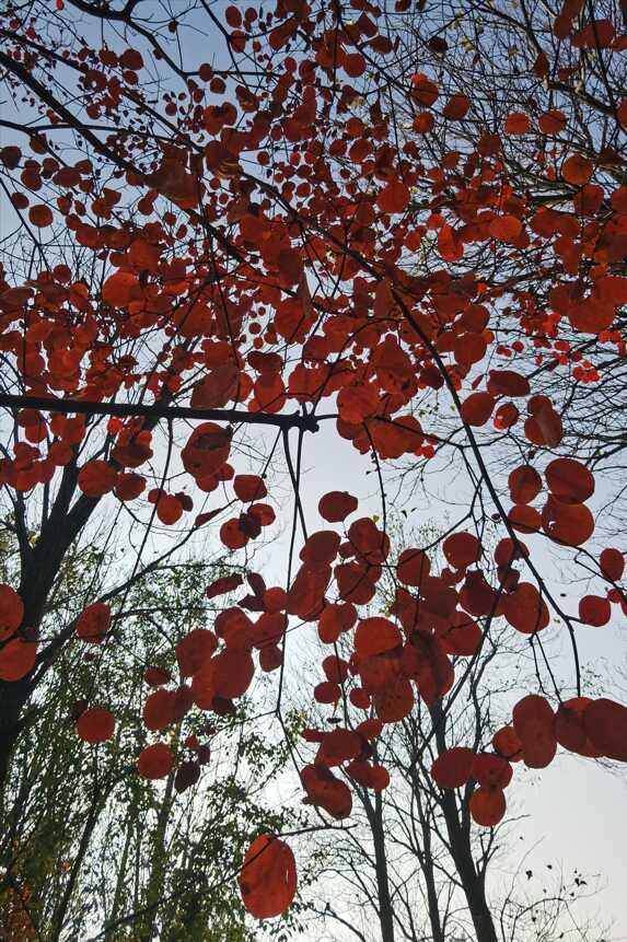 而最引人注目的,莫过于如火焰般的红色和紫色。这主要归功于另一类色素——花青素。与类胡萝卜素不同,大部分花青素是叶片在秋季新合成的。当叶绿素分解,糖分被困在叶片中,在充足的阳光和低温条件下,这些糖分便转化成花青素。花青素的颜色非常依赖细胞的酸碱度,在酸性条件下呈红色,碱性条件下则偏蓝紫色。因此,我们能看到枫树、黄栌、乌桕等展现出从猩红到紫红的丰富色调。